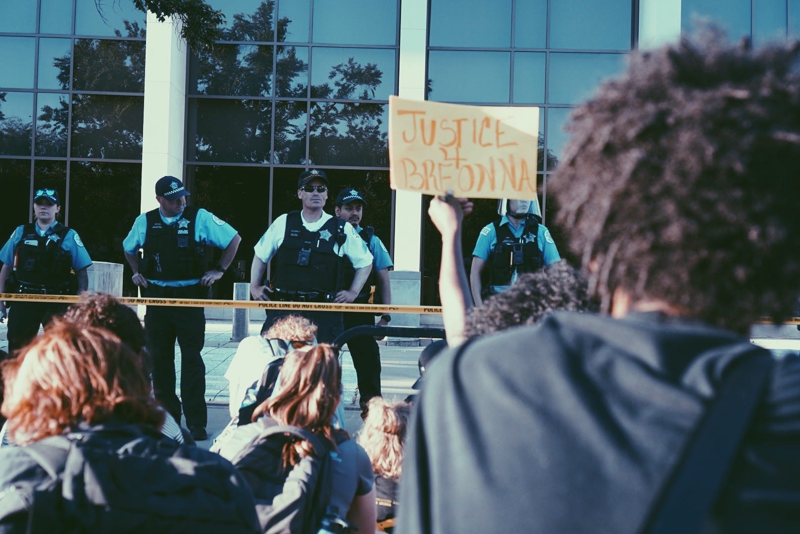 For instance, this standoff between citizen-activists and Chicago’s “Finest” features an assembly line of cops separated by yellow tape and bike barriers. The concrete they stand on is the only sturdy foundation folks can use as a resting place. As Tricia Hersey notes, “rest is resistance.” The coalition captured in the photo takes a Kaepernick-style knee while James Cameron’s T-1000 from 1991’s Judgment Day looks on with a stern face. Affixed with a body cam, hat, and shades, the summer weather has him looking more like Top Gun rather than SWAT. His brothers and sisters in blue flank him on each side while the human subjects in front of them are kneeling or sitting. While most of the lens’s focus is on the left and middle thirds of the photo, the real subject of the photo is the “Justice 4 Breonna” poster that’s vibrant, but slightly obscured by the shadow and aperture. While JonLeo suggested that “this was a mistake and he wished the poster was more in focus;” as an observer, I felt that this “blunder” was intentional especially given how the world – and the two warring parties in the picture’s composition – views Black women. I thought that the picture, specifically with the shade looming over the bright, but erasured text on the poster was symbolic of the way Black women have been (mis)treated, ignored, and exiled; and because of patriarchy, racism and sexism, and misogynoir, their bodies, rights, and ideals have been rendered invisible to the American public.